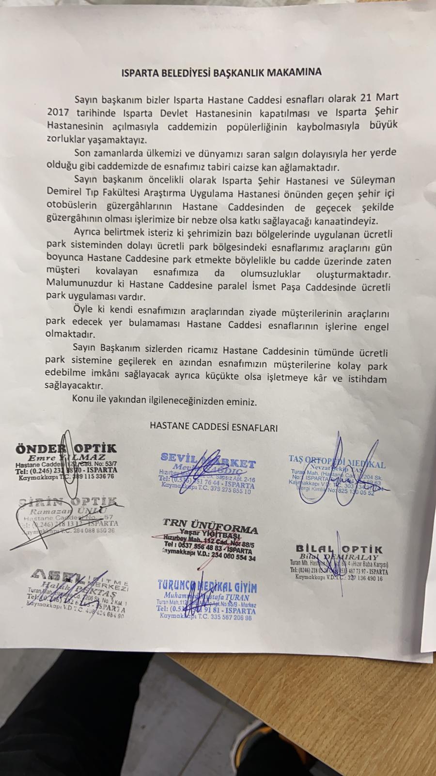 Yaşadıkları zor günler de seslerini Isparta Belediye Başkanı Şükrü Başdeğirmene duyurmak isteyen hastane caddesinde bulunan 42 esnaf imza toplayarak dilekçe yazdılar. Otobüs güzergahlarının tekrar hastane caddesinden geçmesini isteyen cadde esnafı bir nebze olsun caddeye tekrar hareketlilik geleceğinin umudunda. Devlet Hastanesinin Kapatılıp Şehir Hastanesi olmasıyla birlikte sakin bir caddeye dönüşen hastane caddesin de kimi esnaf kepenk indirirken, kimi esnaf ise işler olmadığı için dükkan dahi açmıyor.