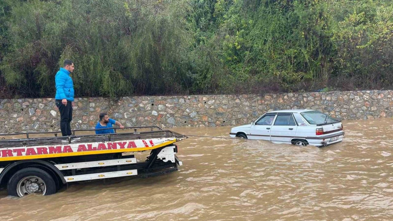 Antalya’nın Alanya ilçesinde etkili olan sağanakta su altında kalan D 400 karayolunda bazı araçlar mahsur kaldı.