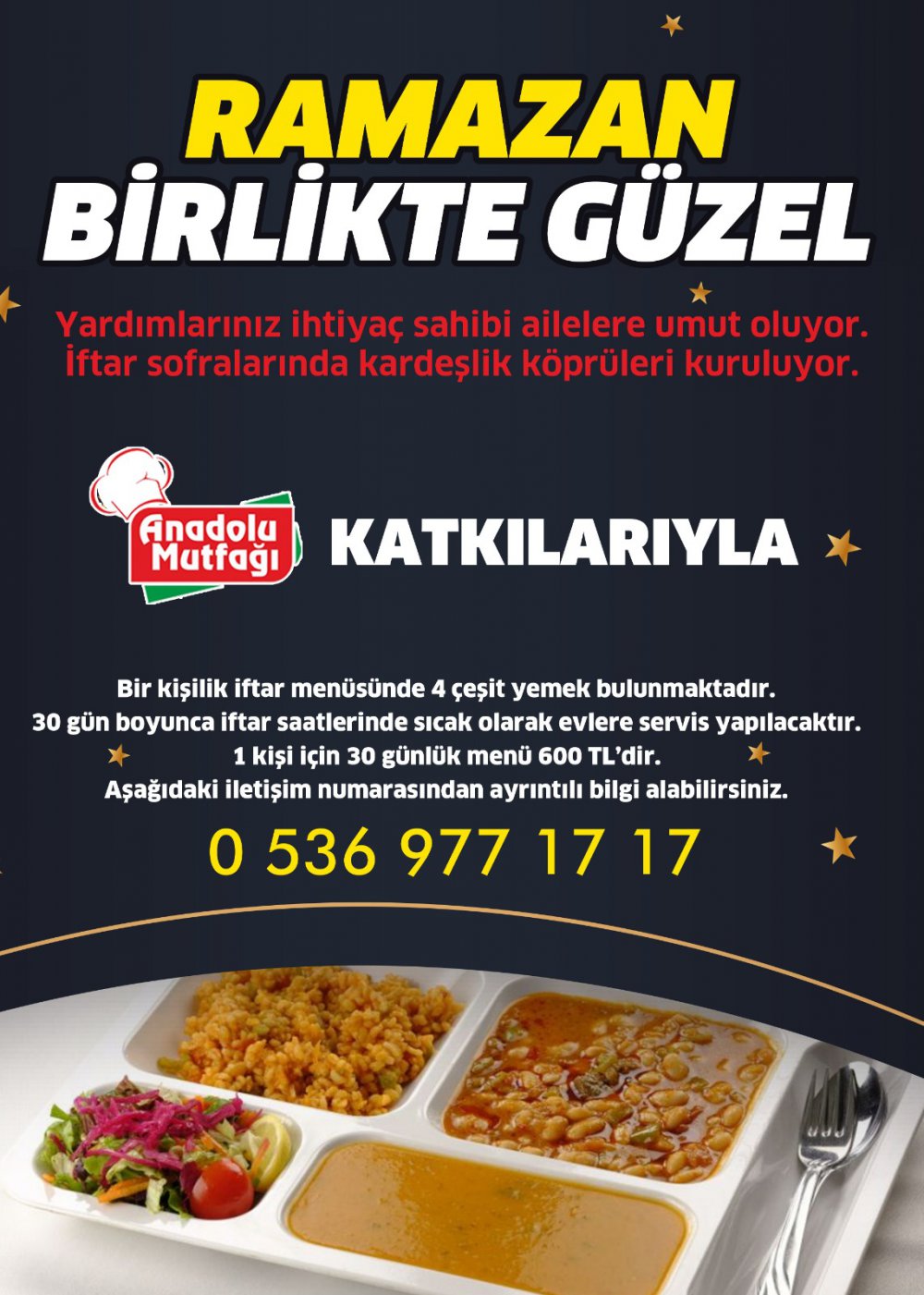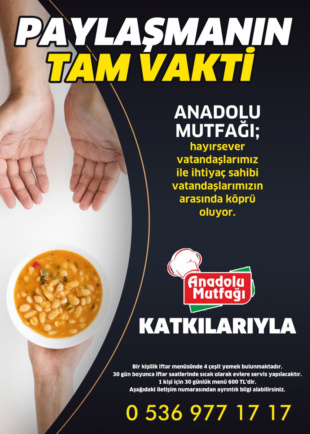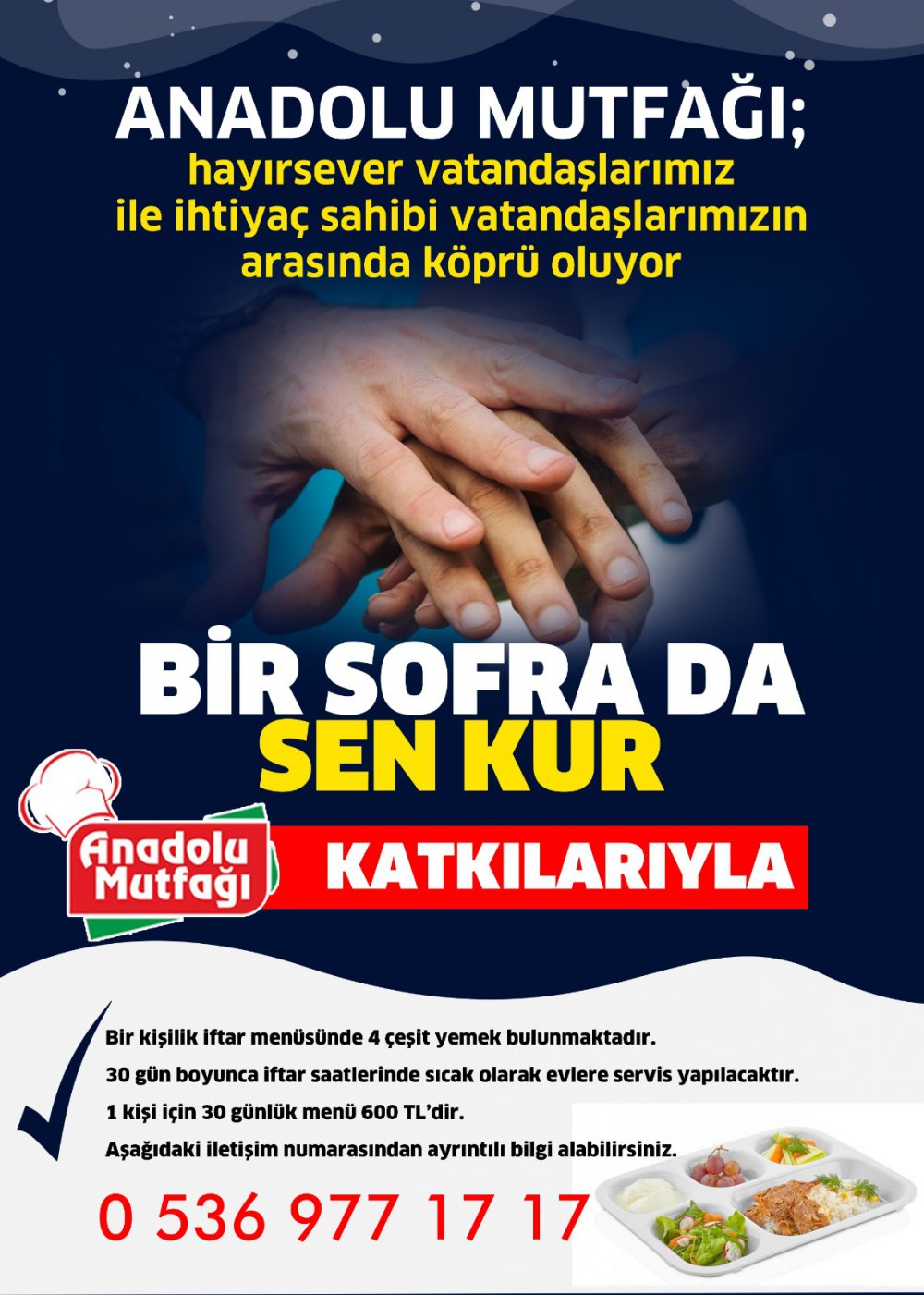 'Yardımlarınızihtiyaç sahibi ailelere umut oluyor. İftar sofralarında kardeşlik köprüleri kuruluyor' sloganıyla yola çıkan Anadolu mutfağı Hayırsever vatandaşlar ile ihtiyaç sahibi ailelerin arasında köprü oluyor.
