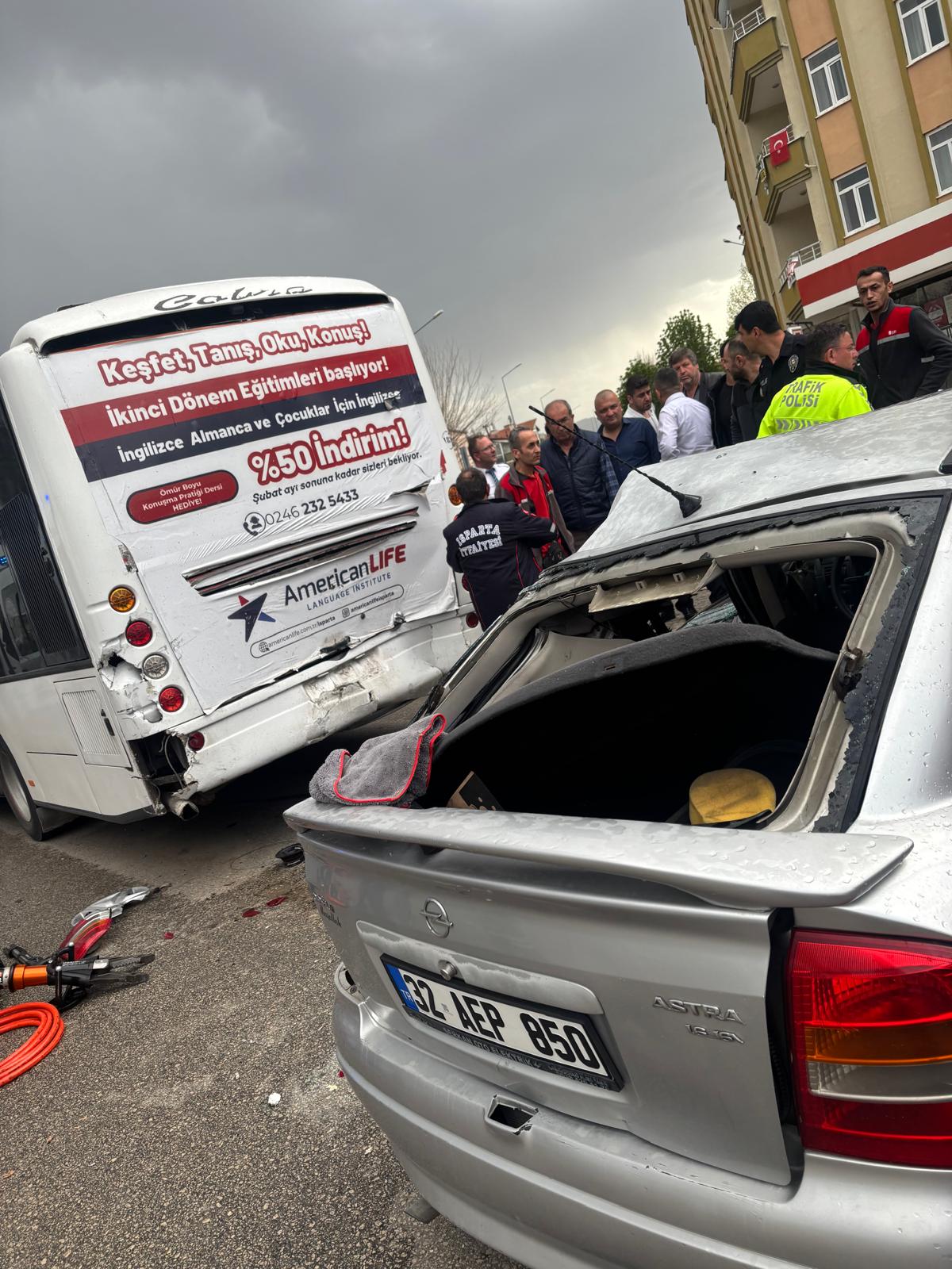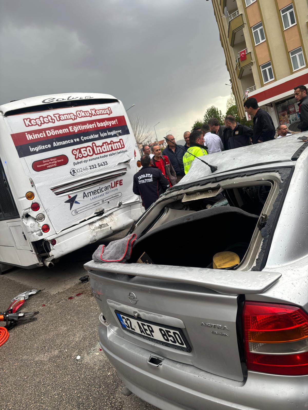 Isparta’nın Çünür Mahallesi 5330 Sokak üzerinde akşam saatlerinde meydana gelen trafik kazasında 3 kişi yaralandı. Edinilen bilgilere göre, 32 AEP 850 plakalı otomobil, trafik ışıklarına yaklaştığı sırada önünde ilerleyen halk otobüsüne arkadan çarptı.