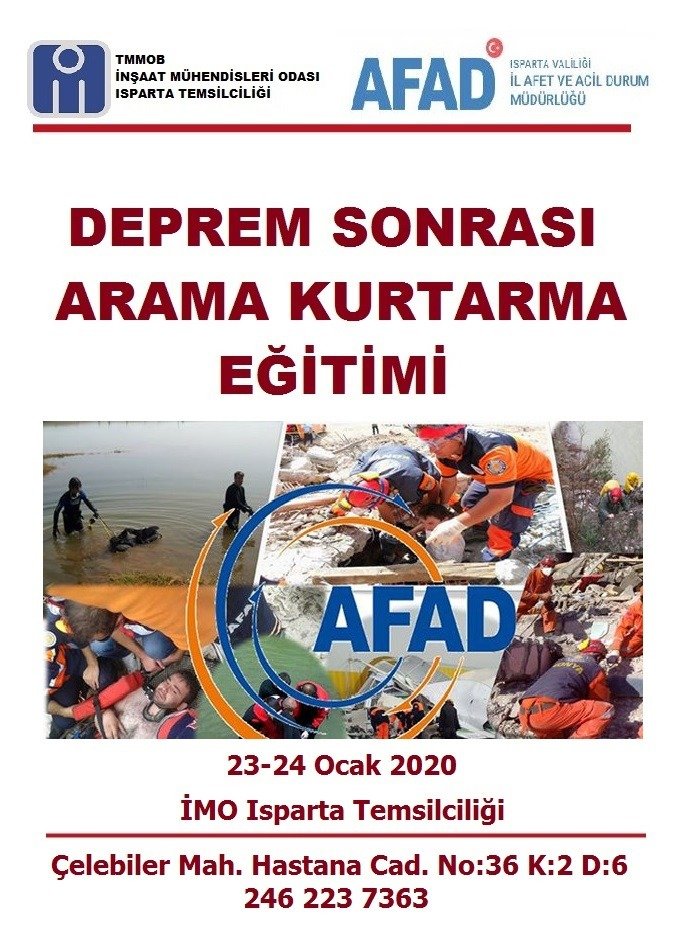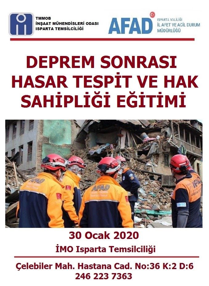 Bu bağlamda İnşaat Mühendisleri Odası Isparta Temsilciliğinde, 23-24 Ocak 2020 de “Arama Kurtarma” ve 30 Ocak 2020 Tarihinde de “Hasar Tespit ve Hak Sahipliği” eğitimi düzenlenecek olup, eğitime Isparta ilinde yaşayan mühendis ve mimarlar katılabilecektir. Burada bizim amacımız ne kadarda olmasını istemediğimiz bir deprem sonrasında yapı bilgisine sahip tüm teknik insanların yardıma bilinçli bir şekilde hazır bulunmasıdır. Bu bağlamda AFAD Isparta Müdürlüğü ile birlikte 2 aşamadan oluşan eğitim düzenlenecektir.