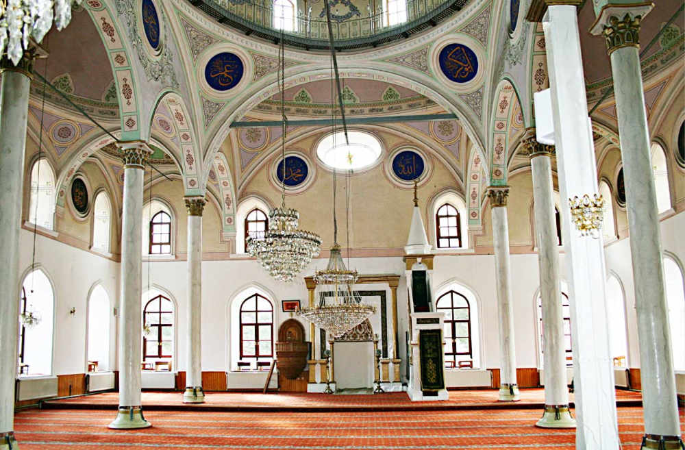 Harimde kadınlar mahfilinin bulunduğu bölüm haricinde çatı örtüsü, ortada merkezi bir kubbenin dört yanındaki birer elips, köşelerde ise birer küçük kubbeden oluşmaktadır. Kadınlar mahfili üstü ise ortada elips, iki yanda birer küçük kubbe ile örtülmüştür. Alttan sütunlara binen sivri kemerlerle taşınan örtülere geçiş pandantiflerle sağlanmıştır. Merkezi kubbede sekiz pencere açıklığı bulunmaktadır.