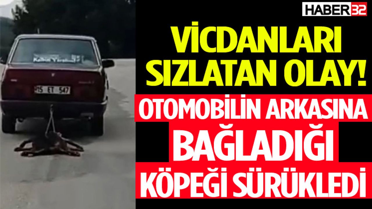 Edinilen bilgilere göre, otomobil sürücüsü Sazak yolu üzerinde otomobilin arkasına köpeği bağlayarak sürükledi. Motosikletli bir genç tarafından takip edilen otomobilin köpeği sürüklediği anlar cep telefonu ile görüntülendi.