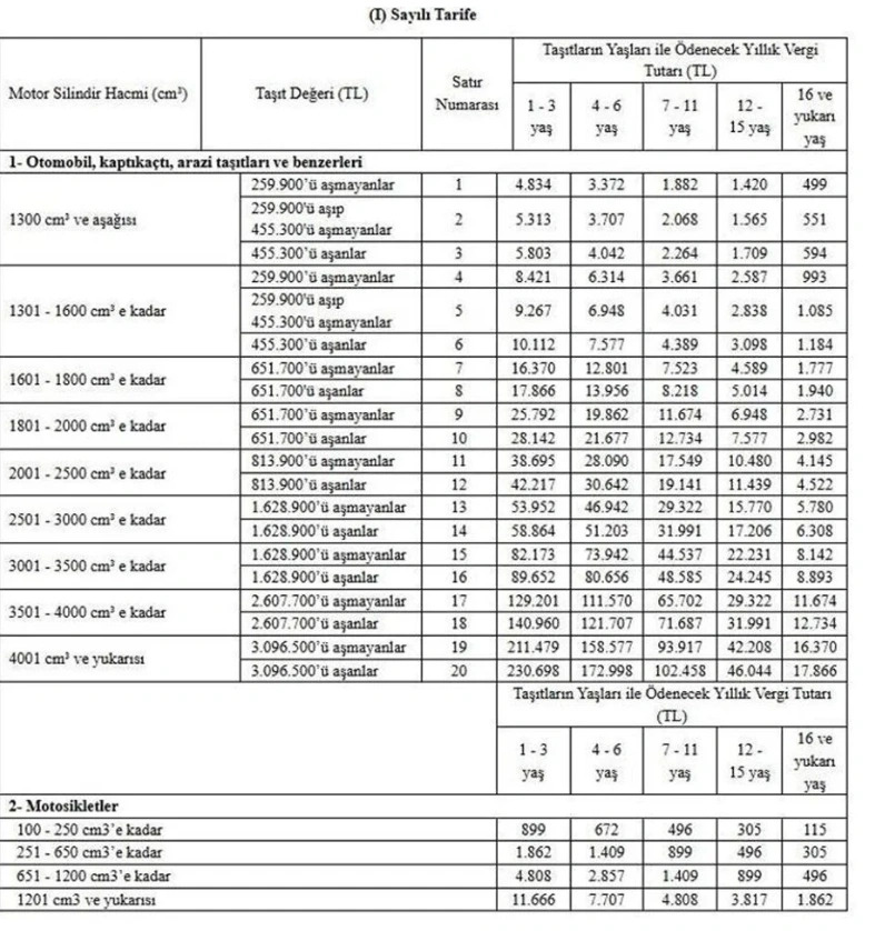 - 1.300 cc’den düşük motor hacmine sahip, değeri 455 bin 300 lirayı aşan ve 1-3 yaş arasındaki araçların yıllık MTV tutarı 5.803 lira oldu.