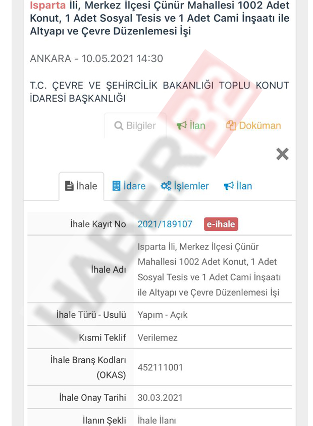 T.C. Çevre ve Şehircilik Bakanlığı Toplu Konut İdaresi Başkanlığı tarafından Isparta'ya yapılacak 1002 adet konut, 1 adet sosyal tesis, 1 adet cami inşaatı, alt yapı ve çevre düzenlemesi işinin ihalesi 10.05.2021 tarihinde Ankara'da yapılacak.