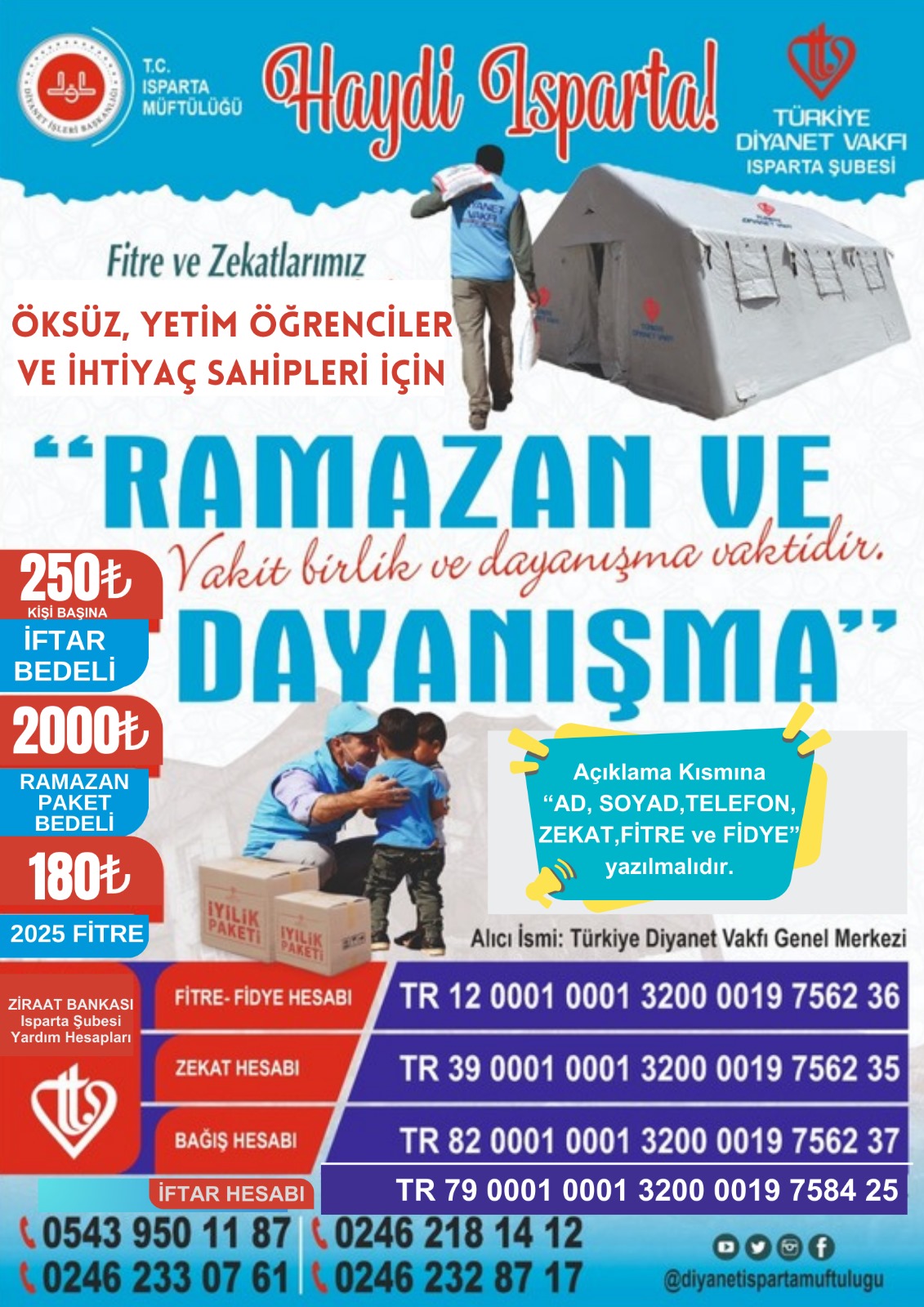 Vatandaşlarımız 2025 yılı Fitre Bedeli 180 TL, Kişi Başı İftar Bedeli 250 TL, Ramazan Paket Bedeli 2000 TL ve diğer bağışlarını Isparta Müftülüğü Türkiye Diyanet Vakfı Isparta Şubesine gelerek veya ekteki görselde belirtilen IBAN NUMARALARINA bağış yapabilirler.