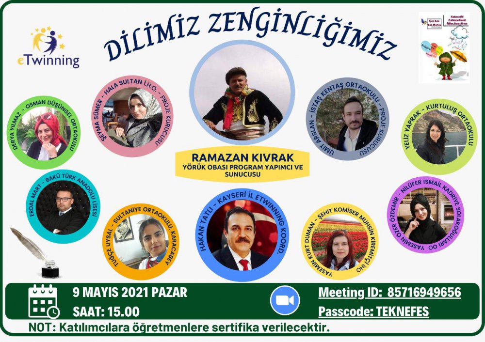 Dilimizin zenginliklerine dikkat çekmek ve yabancı sözcük kullanmaya karşı kalemleriyle savaş açan proje ekibi, “Dilimiz Zenginliğimiz” temasıyla yeni bir etkinlikle farkındalık oluşturmayı amaçladı. 9 Mayıs 2021 Pazar günü düzenlenen etkinlikte proje ekibi okullarının yönetici, öğretmen ve öğrencilerinin yanı sıra birçok okuldan öğretmen ve öğrenciler de katılım sağlayarak Türkçemiz için tek nefes oldular. Proje mimarlarından olan okulumuz Türkçe Öğretmeni Yasemin KURT Duman’ın da içlerinde bulunduğu Türkçe sevdalısı yedi öğretmen ve öğrencilerinden oluşan eTwinning proje ekibi, yaptıkları faaliyette katılımcıların gönül tellerine dokunan sunumlarıyla izleyicilerin beğenisini kazandılar. Programa Fethiye Yörük Türkmen ve Kültür Derneği Başkanı, televizyon programı yapımcısı ve yazar Ramazan Kıvrak konuk oldu. Yirmi yıldır Yörükler üzerine araştırmalar yapan Ramazan Kıvrak ülkemizin birçok köyünden yapmış olduğu Yörük Obaları programı ile yöresel söyleyiş farklılıklarını derleme ve paylaşma imkânı bulmuştur. Bu zengin bilgi birikimini katılımcılarla paylaşan ve onları geçmişin keyifli günlerine götürerek dilimizin zenginliğini ortaya koymuştur. Ramazan Kıvrak program sonunda kulaklarımızda ninelerimizin, dedelerimizin söyleyişlerinden hoş bir seda bırakmıştır. Program proje ortağı öğretmenlerimizin dilimizin zenginliği olan söyleyiş farklılıklarımızla ilgili yaptıkları konuşmalar ve projede görev alan öğrencimizin kendi yazmış olduğu Ben Türkçeyim şiirini seslendirmesi ile son bulmuştur.