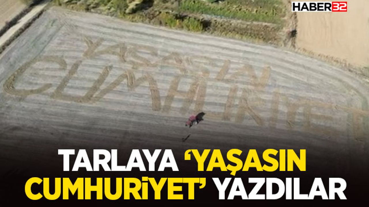 Muhtarlığa ait traktör kullanılarak bir tarlanın yüzeyine dev harflerle "YAŞASIN CUMHURİYET" yazısı yazıldı.