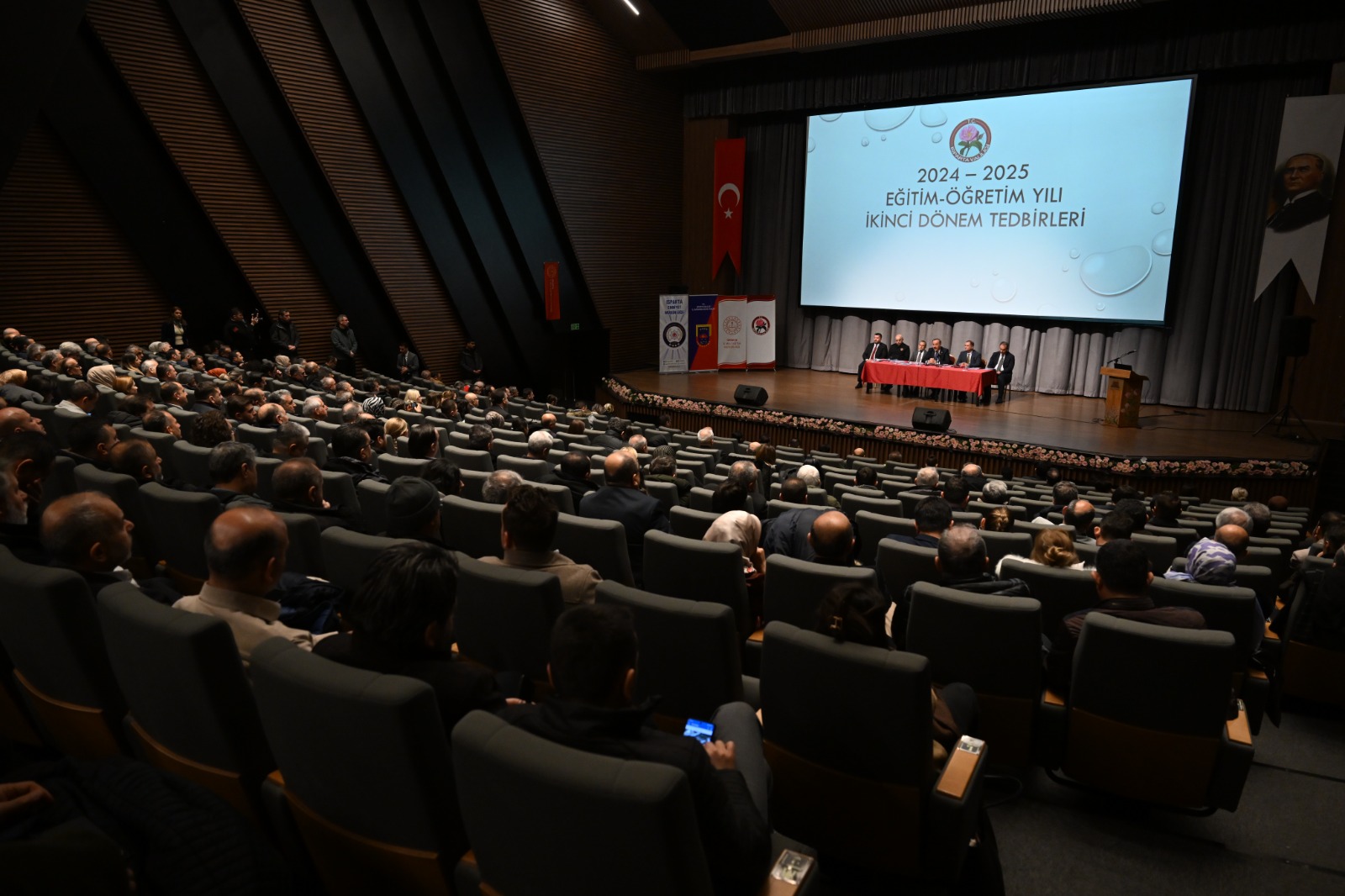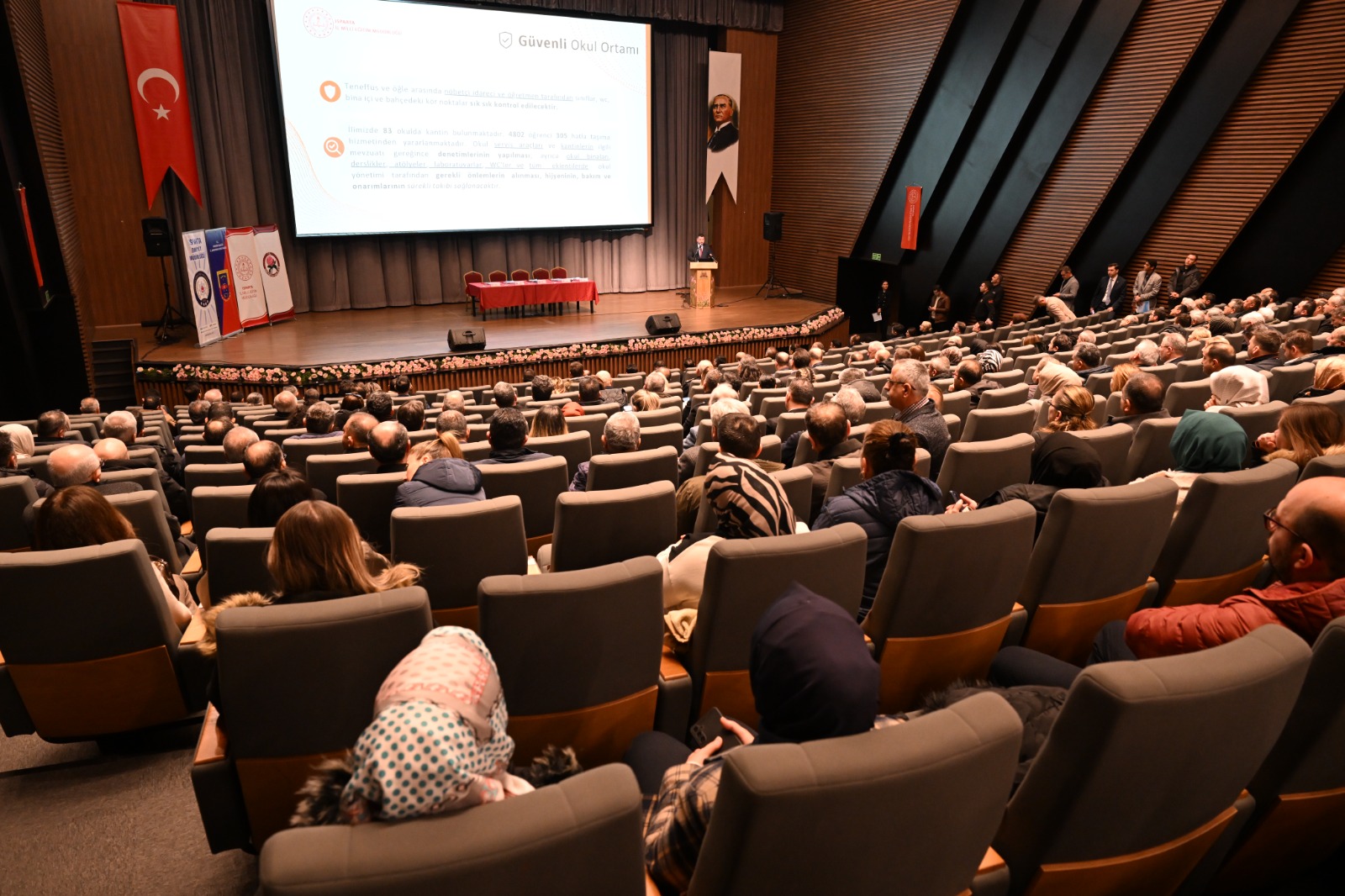 Isparta Belediyesi Kültür Merkezi’nde düzenlenen toplantıda İl Milli Eğitim Müdürlüğü, İl Emniyet Müdürlüğü ve İl Jandarma Komutanlığı tarafından alınan tedbirlerle ilgili sunumlar yapıldı.